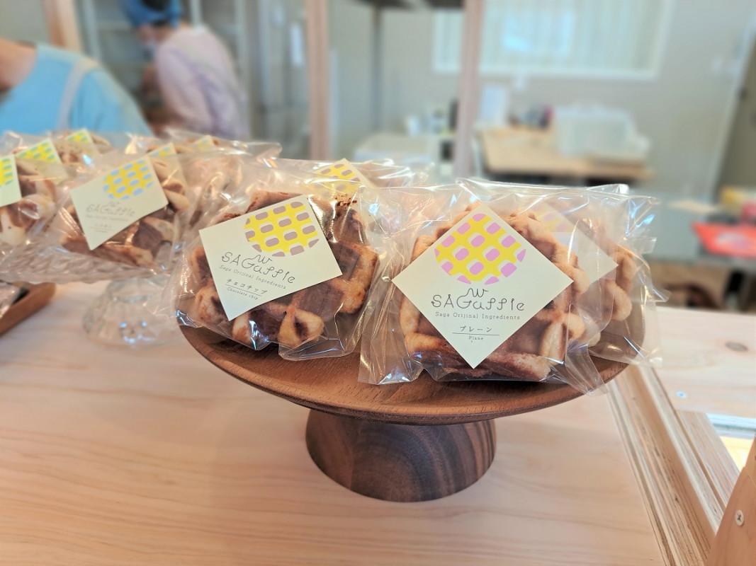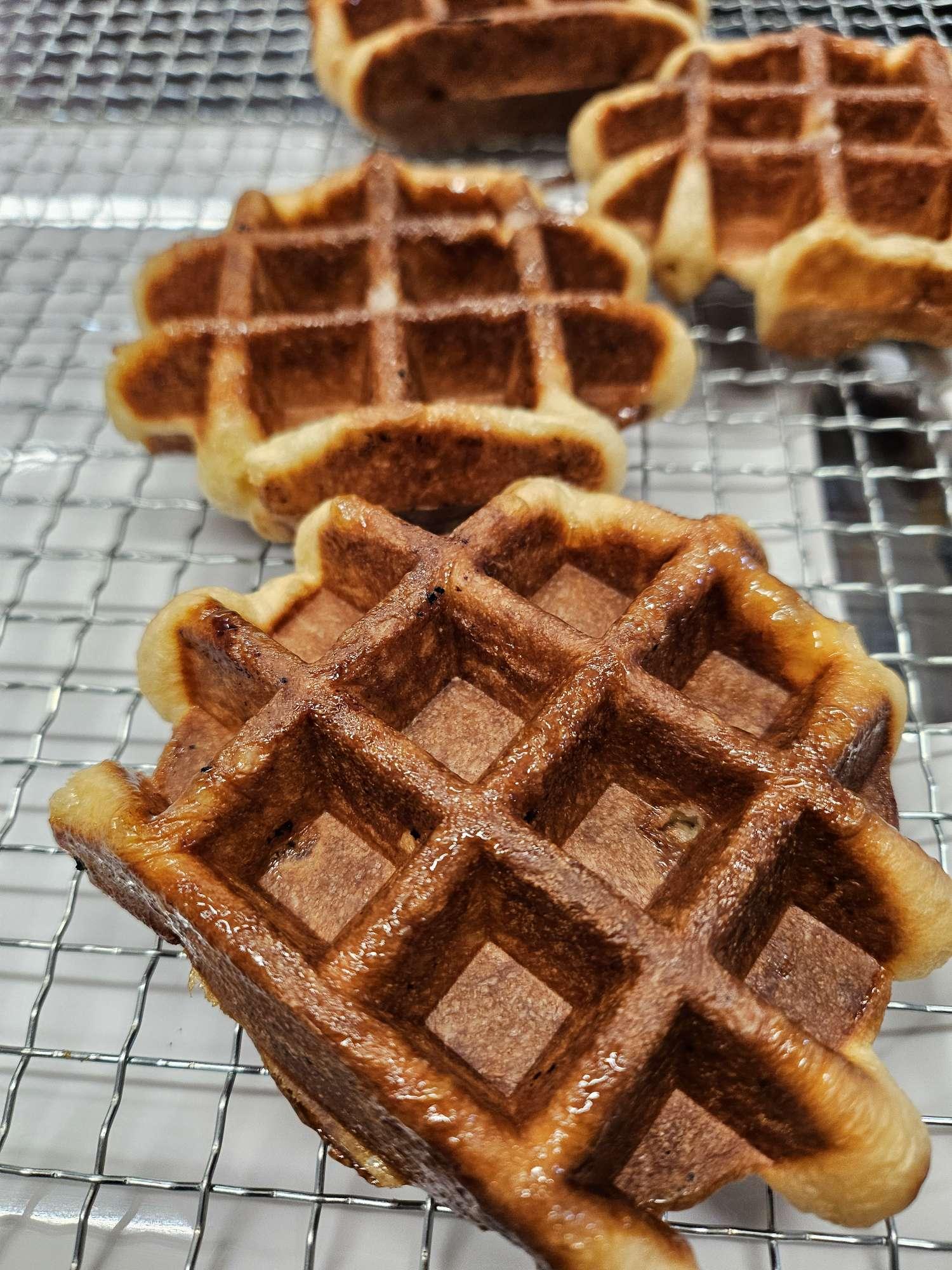 本場ドイツから取り寄せたワッフルメーカーで焼き上げたリエージュワッフル数種類の焼き立てワッフル(¥200~)が並びます